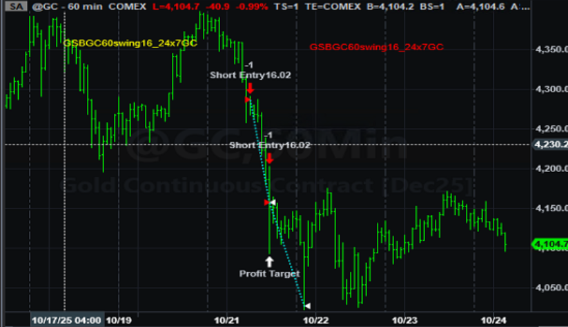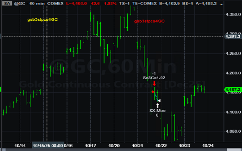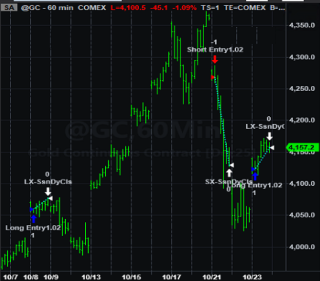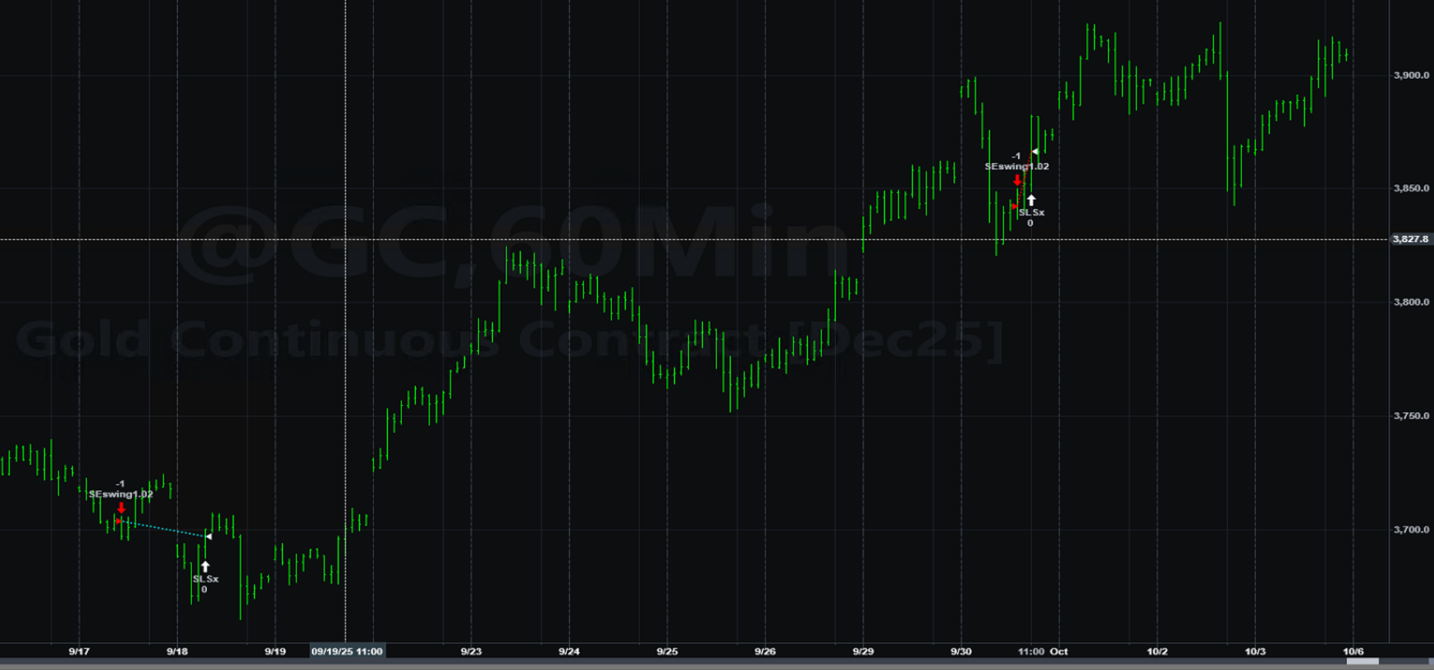 October 2025 was the most volitile month in gold futures history. Results for systems varied from no trades for the month, to in one day just under 13,000 win for a day trade system and 2 * 13,000 wins for a swing trade.